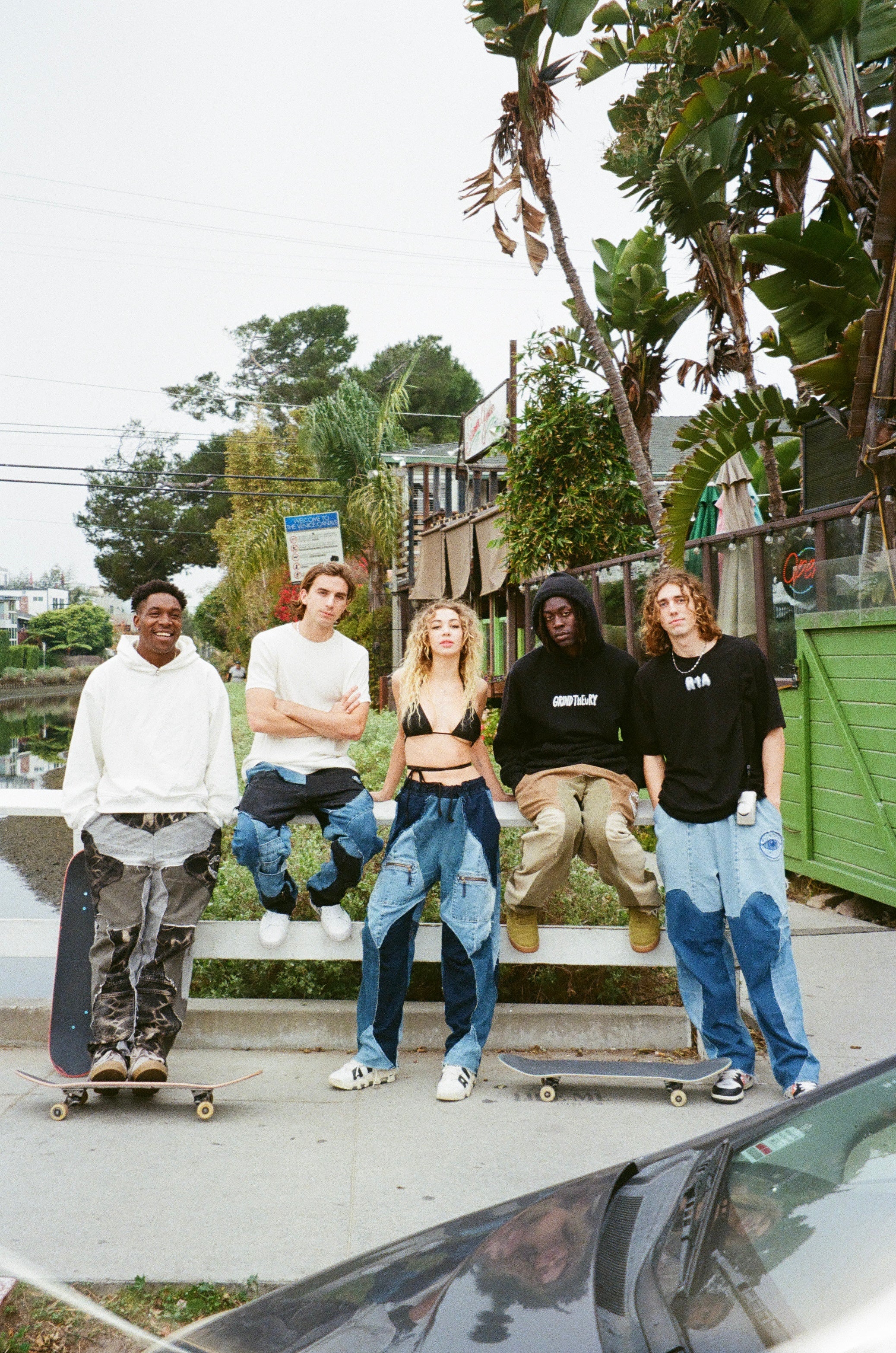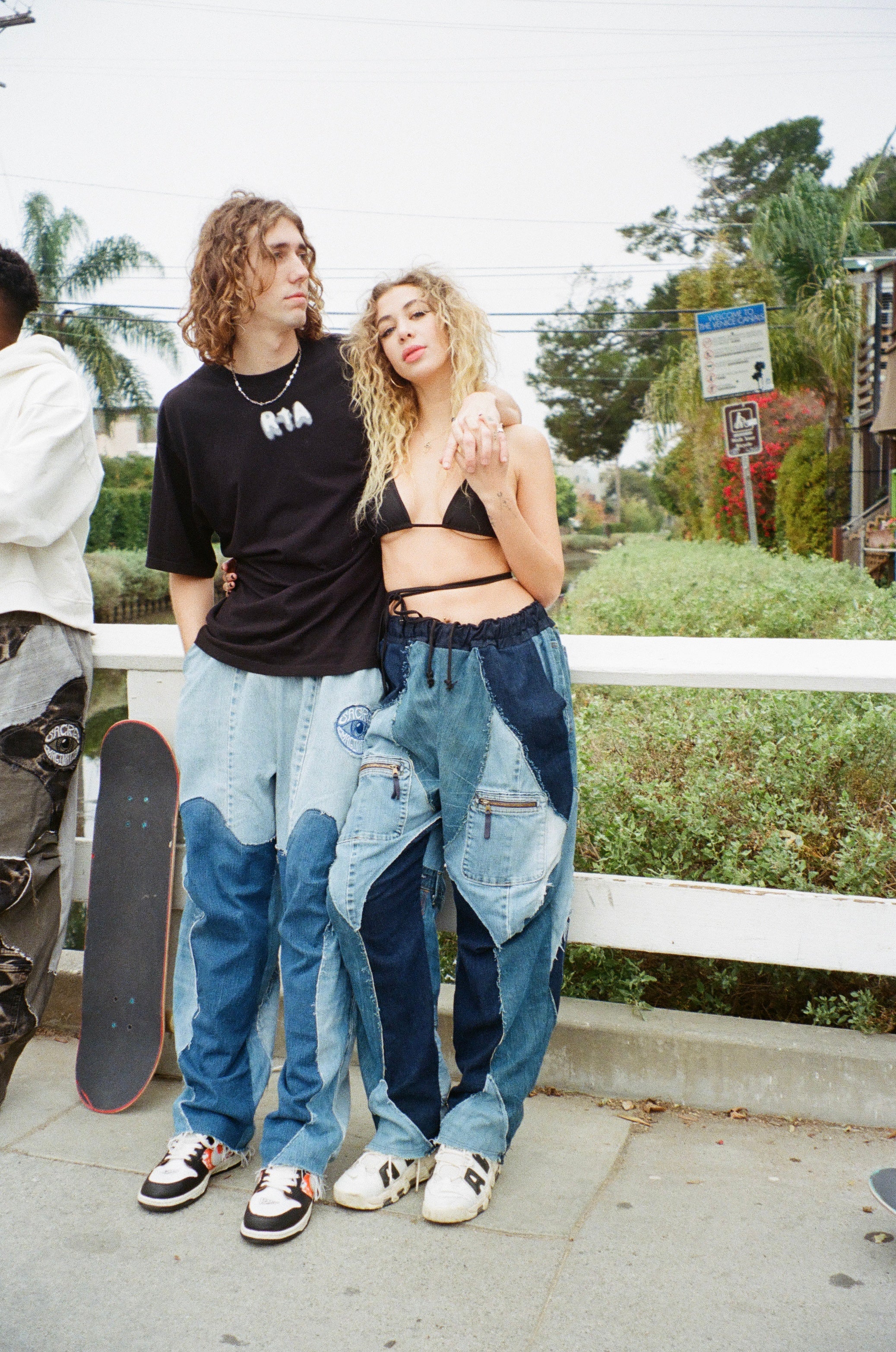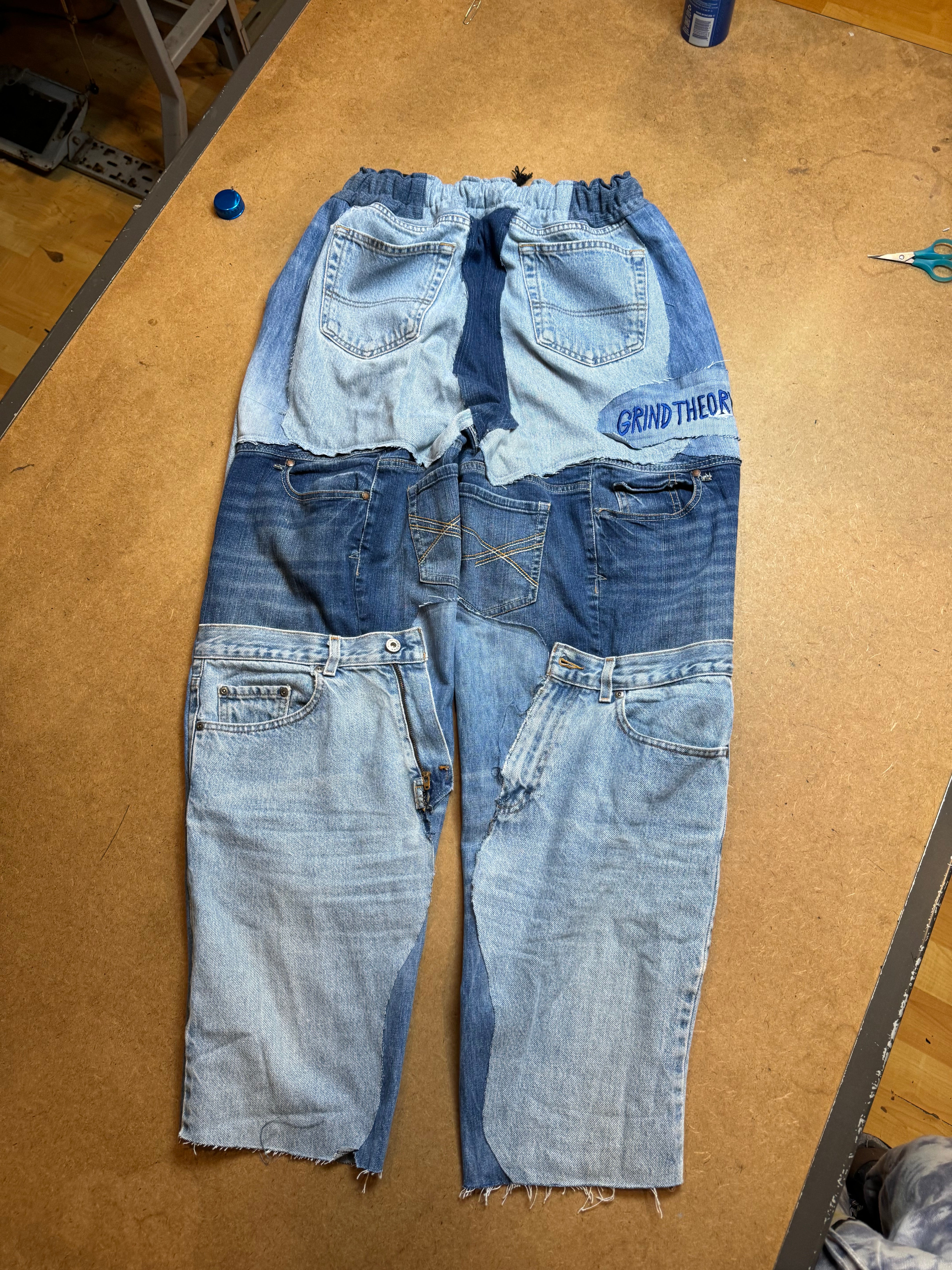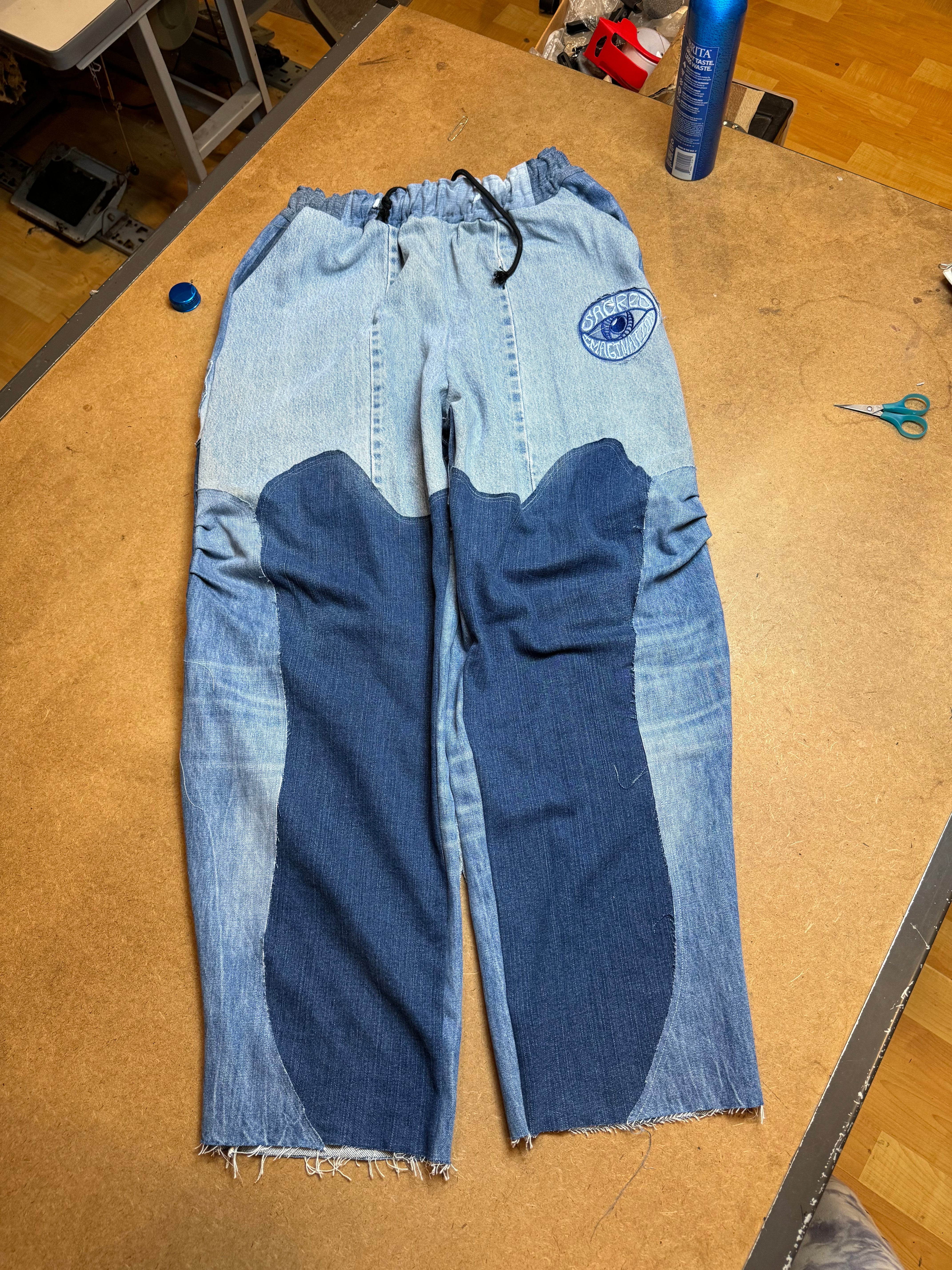 Made from three pairs of vintage denim pants that were reimagined as one piece of wearable art. Pleats around the knees for added mobility and function. Adjustable drawstring waistband.