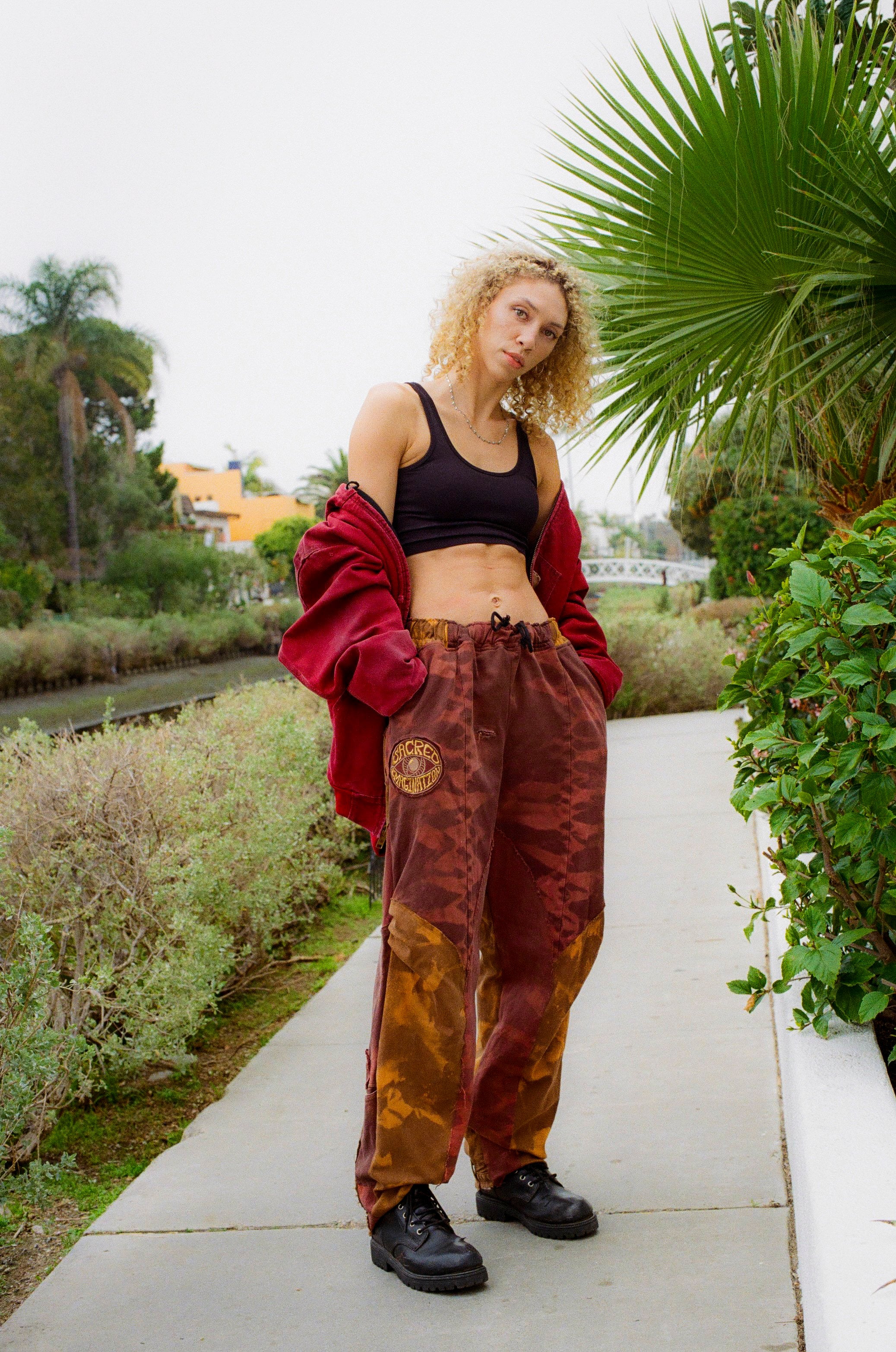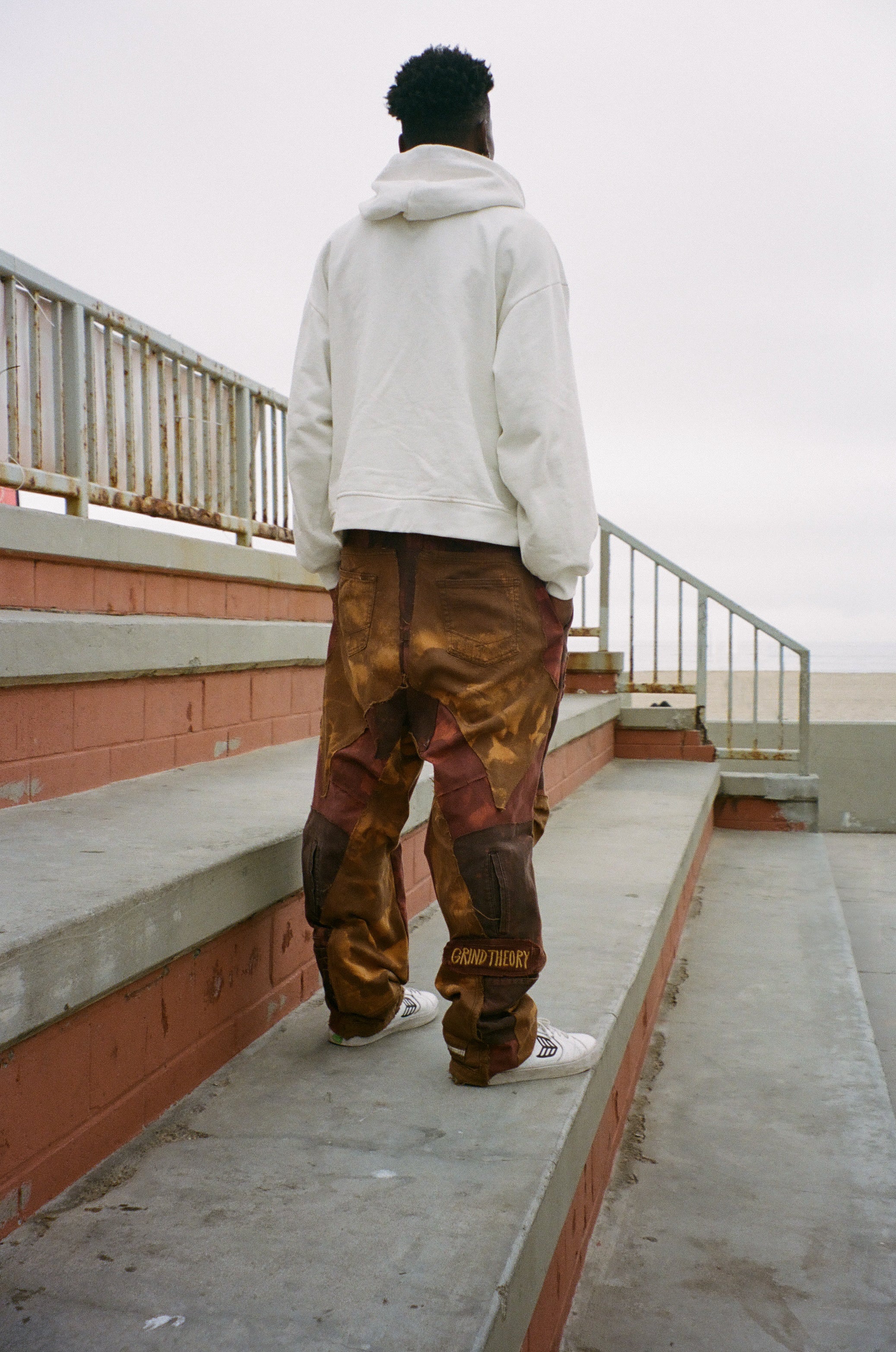 Made from three pairs of vintage denim pants that were reimagined as one piece of wearable art. Pleats around the knees for added mobility and function. Draw string adjustable waistband.